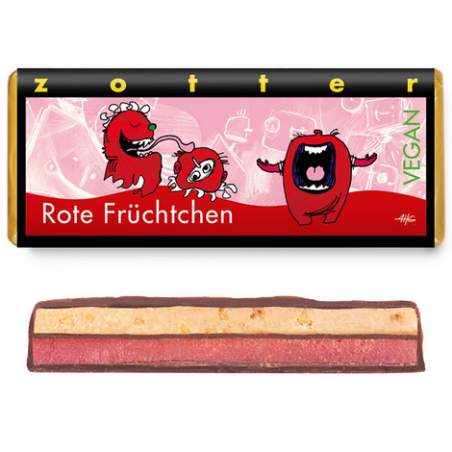Czekolada owsiana 50% z nadzieniem z ganache z czerwonych owoców i praliną migdałową z kawałkami owoców