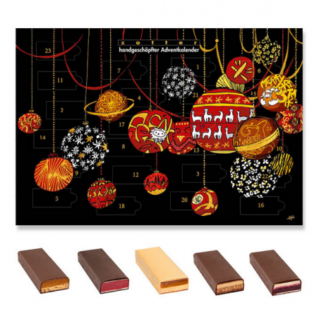 Elegancki duży kalendarz ścienny, wypełniony 24 różnymi ręcznie robionymi mini czekoladkami w uwodzicielskich odmianach - mleczny karmel, likier jajeczny, Marc de Champagne, maliny i piernik z owocami. Różnorodność czekolady w ekologicznej i uczciwej jakości oraz piękny design osłodzą sezon adwentowy.