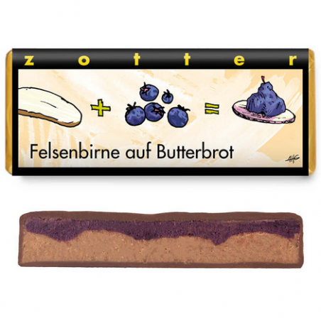 50% mleczna czekolada nadziewana ganache z owoców świdośliwy i praliną z orzechów laskowych, uszlachetniona brązowymi okruchami chleba.