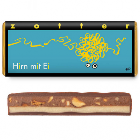 Czekolada, której tak bardzo potrzeba w dzisiejszych czasach: jedna warstwa z karmelizowanym móżdżkiem wieprzowym i domowym ajerkoniakiem z gruszkową brandy, a druga warstwa z praliną orzechową, zawierającą drobno posiekane nerkowce, orzechy laskowe i migdały. Ta czekolada jest pokryta mleczną czekoladą o zawartości 50% kakao.