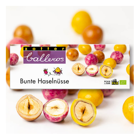 Absolutnie pyszne! Prażone, chrupiące orzechy laskowe Fair Trade w białej czekoladzie w trzech wyrazistych smakach: jeden o wspaniałym smaku cynamonu, jeden w fioletowej polewie z pitai i trzeci w jaskrawożółtej kurkumie z owocową posypką truskawkową.